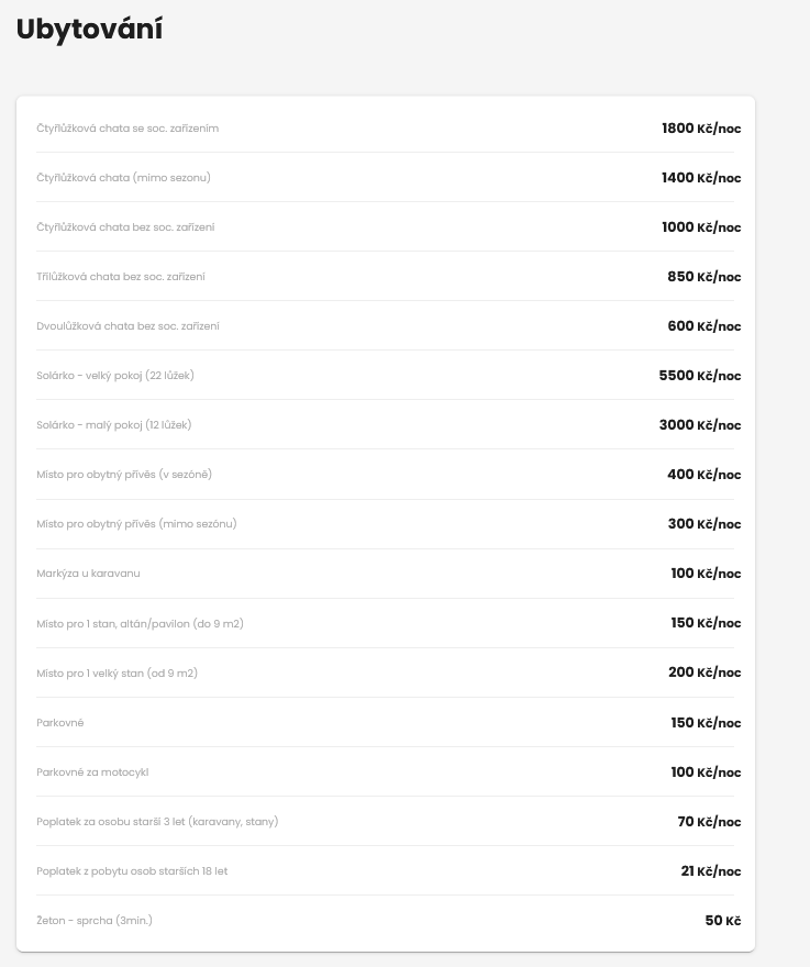 2,3,4L chatky bez soc.zařízením, větší místnost s dvojlůžkem, menší ložnice s palandou. Veškeré chatky bez sociálního zařízení jsou vybavené mikrovlnnou troubou, konvicí a lednicí, samozřejmostí jsou také lůžkoviny.